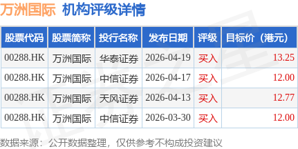 投行对该股的评级以买入为主,近90天内共有4家投行给出买入评级,近90天的目标均价为12.5港元。华泰证券最新一份研报给予万洲国际买入评级,目标价13.25港元。