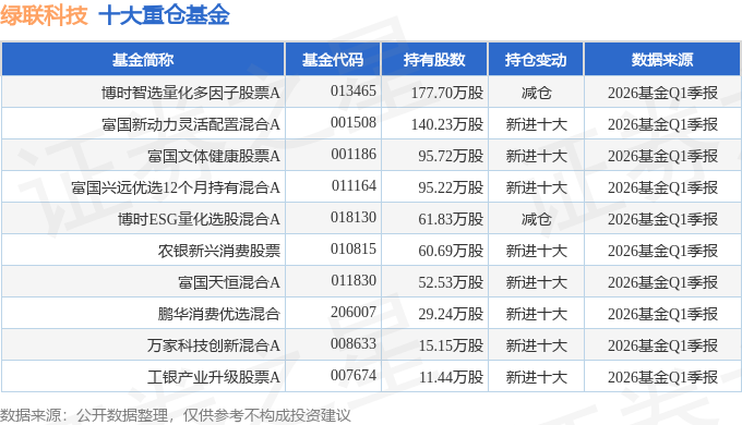 持有绿联科技最多的基金为博时智选量化多因子股票A,目前规模为7.77亿元,最新净值1.2266(4月28日),较上一交易日下跌1.04%,近一年上涨45.19%。该基金现任基金经理为刘钊。