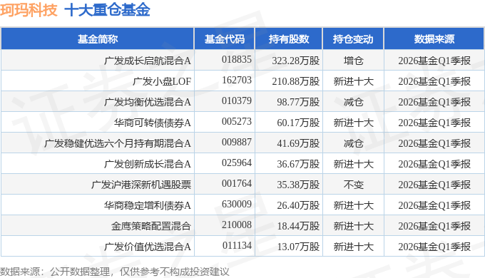 持有珂玛科技最多的基金为广发成长启航混合A,目前规模为33.52亿元,最新净值3.0921(4月28日),较上一交易日下跌0.8%,近一年上涨95.64%。该基金现任基金经理为陈韫中。