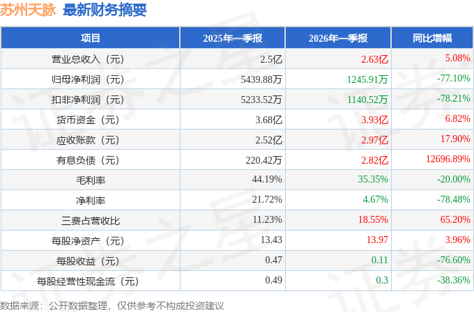 据证券之星公开数据整理,近期苏州天脉(301626)发布2026年一季报。截至本报告期末,公司营业总收入2.63亿元,同比上升5.08%,归母净利润1245.91万元,同比下降77.1%。按单季度数据看,第一季度营业总收入2.63亿元,同比上升5.08%,第一季度归母净利润1245.91万元,同比下降77.1%。本报告期苏州天脉三费占比上升明显,财务费用、销售费用和管理费用总和占总营收同比增幅达65.2%。