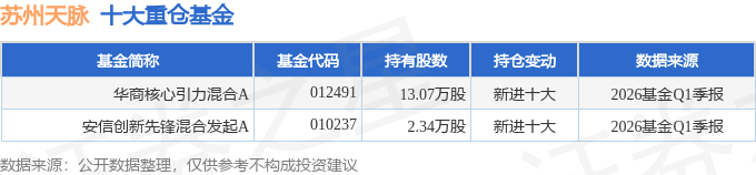 持有苏州天脉最多的基金为华商核心引力混合A,目前规模为4.32亿元,最新净值1.5542(4月28日),较上一交易日上涨1.15%,近一年上涨90.75%。该基金现任基金经理为叶峰。