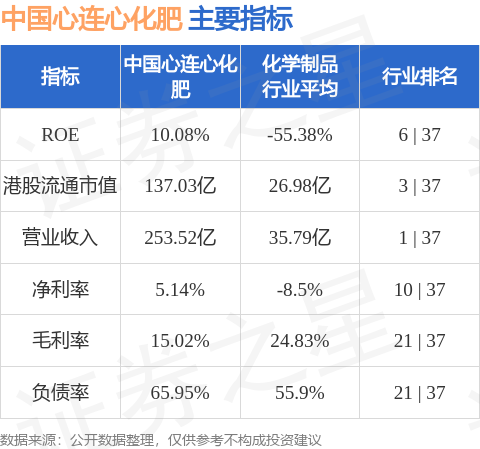 中国心连心化肥港股市值137.03亿港元,在化学制品行业中排名第3。主要指标见下表: