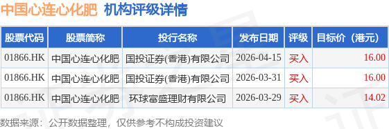 投行对该股的评级以买入为主,近90天内共有3家投行给出买入评级,近90天的目标均价为15.34港元。国投证券(香港)有限公司最新一份研报给予中国心连心化肥买入评级,目标价16港元。