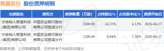 证券之星消息,慈星股份(300307)4月29日公开信息显示,股东宁波裕人智慧科技(集团)有限公司向中国农业银行股份有限公司慈溪分行合计质押4500.0万股,占总股本5.62%。质押详情见下表:
