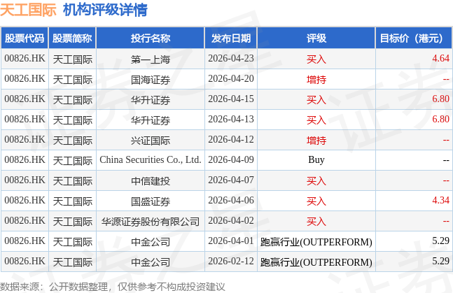 截至2026年4月29日收盘,天工国际(00826.HK)报收于3.47港元,上涨3.27%,成交量807.8万股,成交额2781.81万港元。投行对该股的评级以买入为主,近90天内共有6家投行给出买入评级,近90天的目标均价为5.53港元。第一上海最新一份研报给予天工国际买入评级,目标价4.64港元。