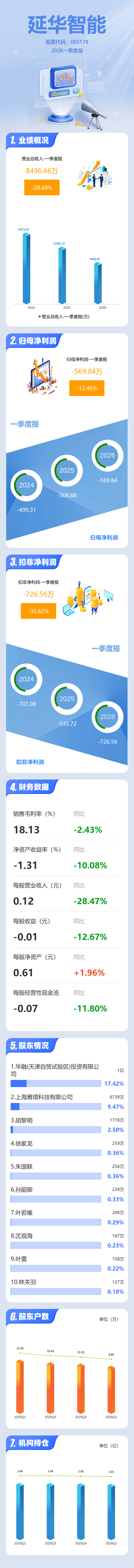 证券之星消息,延华智能2026年一季报显示,一季度公司主营收入8496.66万元,同比下降28.49%;归母净利润-569.84万元,同比下降12.47%;扣非净利润-726.56万元,同比下降35.62%;负债率59.68%,投资收益-76.61万元,财务费用82.25万元,毛利率18.13%。