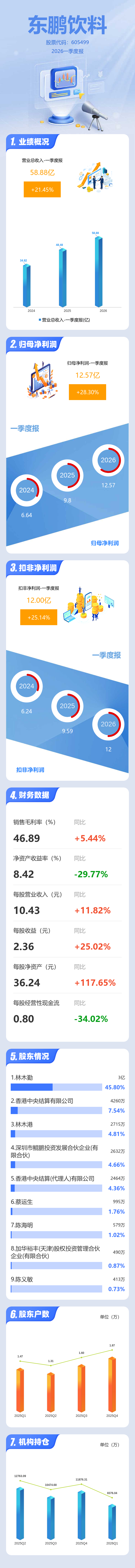 证券之星消息,东鹏饮料2026年一季报显示,一季度公司主营收入58.88亿元,同比上升21.46%;归母净利润12.57亿元,同比上升28.31%;扣非净利润12.0亿元,同比上升25.15%;负债率44.48%,投资收益1994.4万元,财务费用1286.25万元,毛利率46.89%。