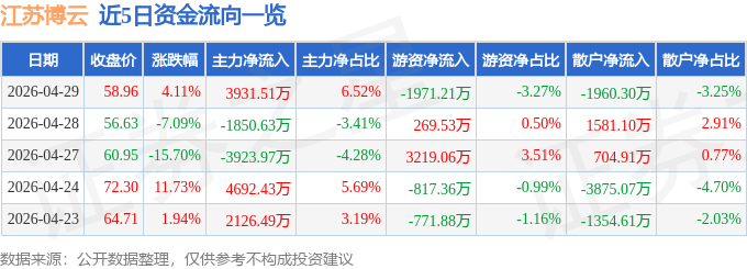 证券之星消息,截至2026年4月29日收盘,江苏博云(301003)报收于58.96元,上涨4.11%,换手率13.68%,成交量10.28万手,成交额6.03亿元。