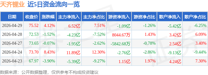 证券之星消息,截至2026年4月29日收盘,天齐锂业(002466)报收于75.52元,上涨4.12%,换手率7.92%,成交量116.85万手,成交额86.72亿元。