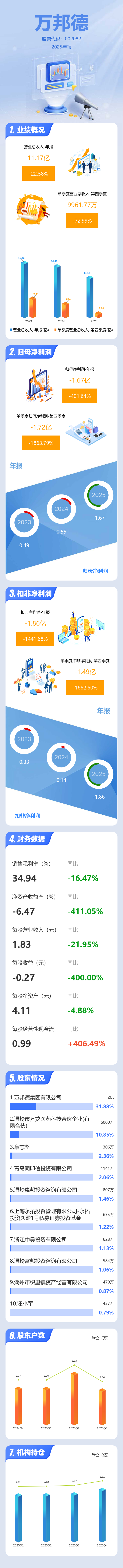 证券之星消息,万邦德2025年年报显示,当年度公司主营收入11.17亿元,同比下降22.59%;归母净利润-1.67亿元,同比下降401.65%;扣非净利润-1.86亿元,同比下降1441.68%;其中2025年第四季度,公司单季度主营收入9961.77万元,同比下降72.99%;单季度归母净利润-1.72亿元,同比下降1863.79%;单季度扣非净利润-1.49亿元,同比下降1662.6%;负债率40.62%,投资收益30.98万元,财务费用2679.48万元,毛利率34.94%。