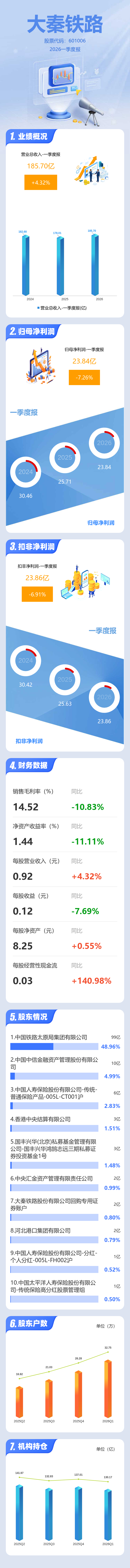 证券之星消息,大秦铁路2026年一季报显示,一季度公司主营收入185.7亿元,同比上升4.32%;归母净利润23.84亿元,同比下降7.26%;扣非净利润23.86亿元,同比下降6.91%;负债率14.06%,投资收益8.34亿元,财务费用-1092.58万元,毛利率14.52%。