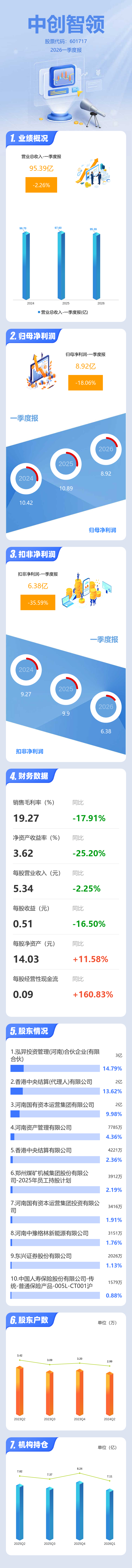 证券之星消息,中创智领2026年一季报显示,一季度公司主营收入95.39亿元,同比下降2.26%;归母净利润8.92亿元,同比下降18.06%;扣非净利润6.38亿元,同比下降35.6%;负债率48.8%,投资收益2789.66万元,财务费用8277.79万元,毛利率19.27%。