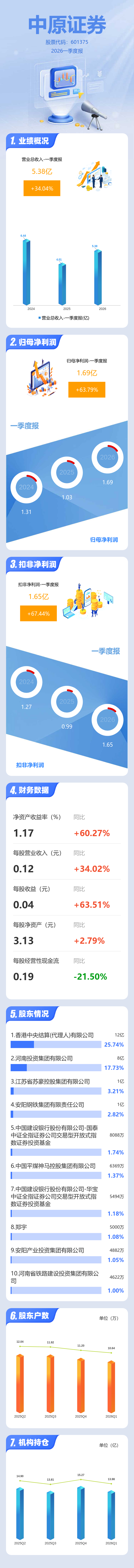 证券之星消息,中原证券2026年一季报显示,一季度公司主营收入5.38亿元,同比上升34.04%;归母净利润1.69亿元,同比上升63.8%;扣非净利润1.65亿元,同比上升67.44%;负债率75.04%,投资收益1.16亿元。