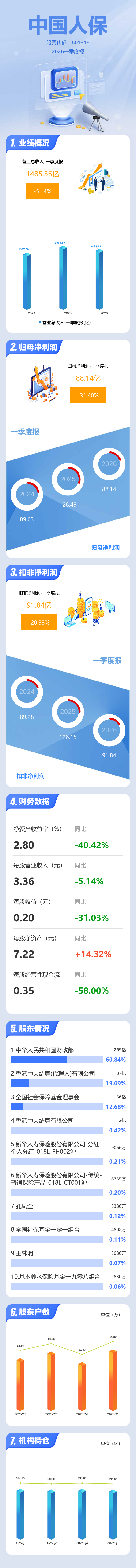 证券之星消息,中国人保2026年一季报显示,一季度公司主营收入1485.36亿元,同比下降5.14%;归母净利润88.14亿元,同比下降31.4%;扣非净利润91.84亿元,同比下降28.33%;负债率78.54%,投资收益219.75亿元。