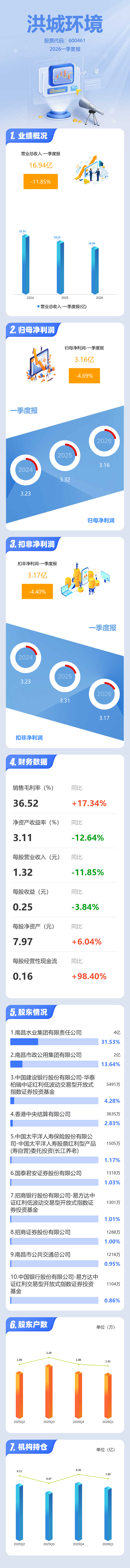 证券之星消息,洪城环境2026年一季报显示,一季度公司主营收入16.94亿元,同比下降11.86%;归母净利润3.16亿元,同比下降4.7%;扣非净利润3.17亿元,同比下降4.41%;负债率54.45%,投资收益-77.7万元,财务费用3600.06万元,毛利率36.52%。