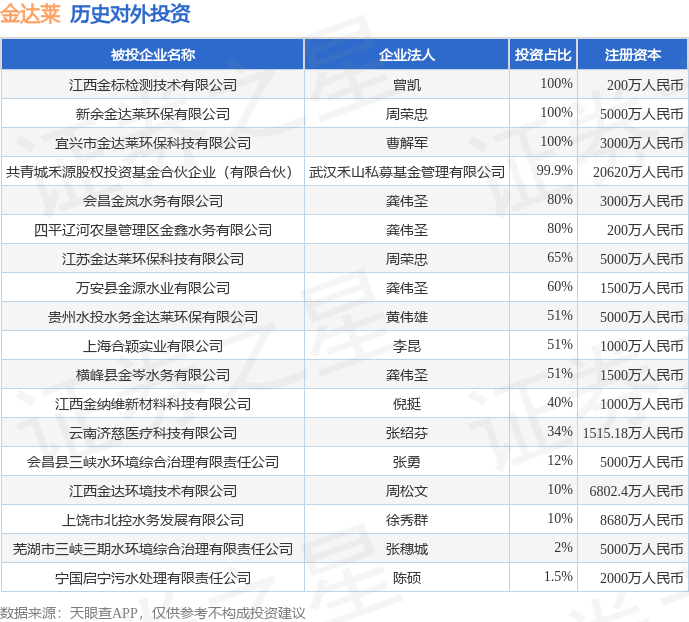 通过天眼查大数据分析,江西金达莱环保股份有限公司共对外投资了28家企业,参与招投标项目775次;财产线索方面有商标信息63条,专利信息166条,著作权信息53条;此外企业还拥有行政许可23个。据2025年报数据,金达莱长期股权投资3379.68万元,同比增519.14%。