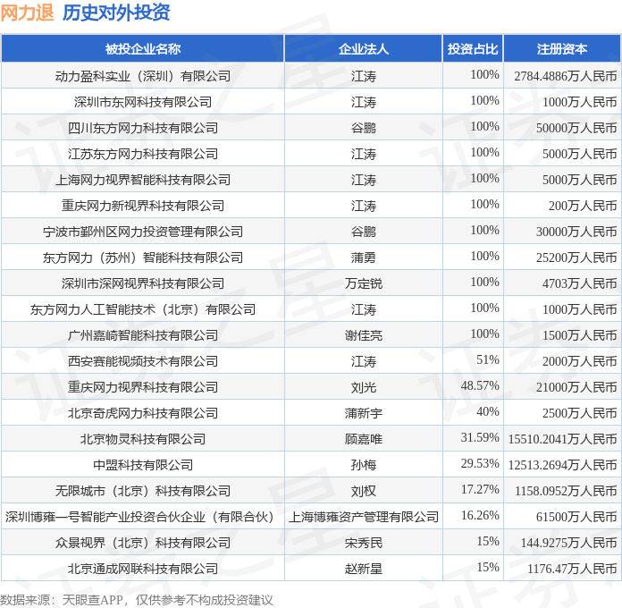 证券之星消息,根据天眼查APP显示,网力退(300367.SZ)新增一起对外投资事件,被投资公司为盯盯拍(深圳)技术股份有限公司,法定代表人罗勇,投资占比为7.59%。该公司从事批发业,注册资本为2061万人民币。目前,网力退共存在对外投资26项,投资占比前20的项目见下表: