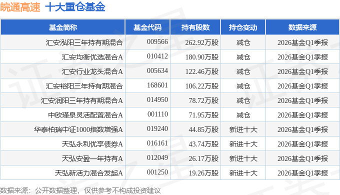 持有皖通高速最多的基金为汇安泓阳三年持有期混合,目前规模为5.14亿元,最新净值1.3976(4月29日),较上一交易日下跌0.51%,近一年上涨46.09%。该基金现任基金经理为邹唯。