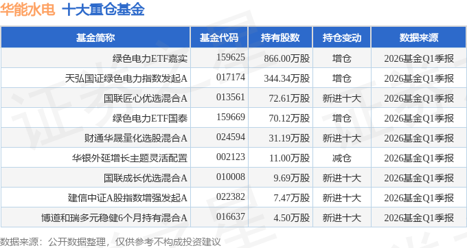 持有华能水电最多的基金为绿色电力ETF嘉实,目前规模为30.94亿元,最新净值1.3154(4月29日),较上一交易日上涨0.13%,近一年上涨15.09%。该基金现任基金经理为王紫菡。