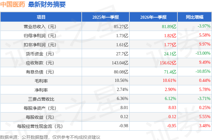 据证券之星公开数据整理,近期中国医药(600056)发布2026年一季报。截至本报告期末,公司营业总收入81.89亿元,同比下降3.97%,归母净利润1.82亿元,同比上升5.58%。按单季度数据看,第一季度营业总收入81.89亿元,同比下降3.97%,第一季度归母净利润1.82亿元,同比上升5.58%。本报告期中国医药盈利能力上升,毛利率同比增幅0.14%,净利率同比增幅5.32%。