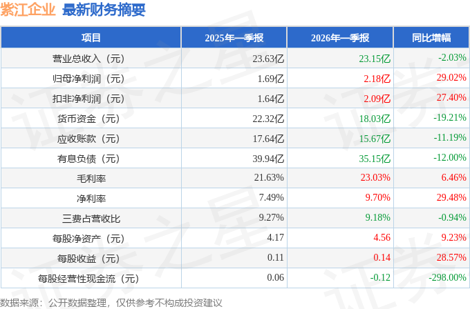 据证券之星公开数据整理,近期紫江企业(600210)发布2026年一季报。截至本报告期末,公司营业总收入23.15亿元,同比下降2.03%,归母净利润2.18亿元,同比上升29.02%。按单季度数据看,第一季度营业总收入23.15亿元,同比下降2.03%,第一季度归母净利润2.18亿元,同比上升29.02%。本报告期紫江企业盈利能力上升,毛利率同比增幅6.46%,净利率同比增幅29.48%。