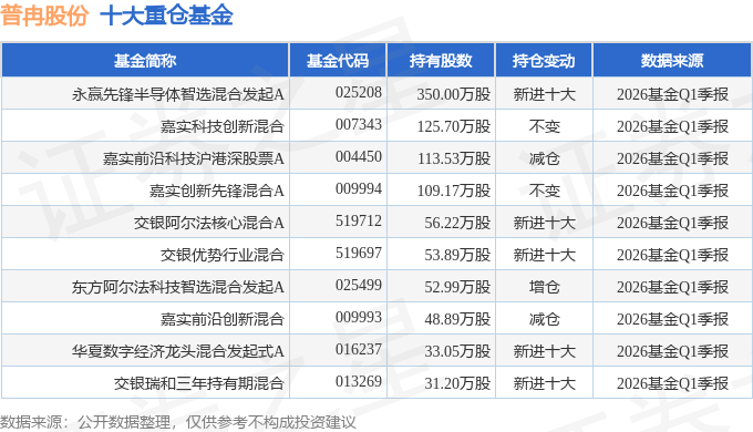 持有普冉股份最多的基金为永赢先锋半导体智选混合发起A,目前规模为14.45亿元,最新净值1.9457(4月29日),较上一交易日上涨1.97%。该基金现任基金经理为张海啸。