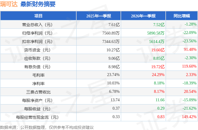 据证券之星公开数据整理,近期瑞可达(688800)发布2026年一季报。截至本报告期末,公司营业总收入7.52亿元,同比下降1.28%,归母净利润5890.58万元,同比下降22.09%。按单季度数据看,第一季度营业总收入7.52亿元,同比下降1.28%,第一季度归母净利润5890.58万元,同比下降22.09%。本报告期瑞可达公司应收账款体量较大,当期应收账款占最新年报归母净利润比达295.94%。