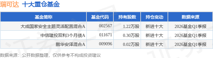 持有瑞可达最多的基金为大成国家安全主题灵活配置混合A,目前规模为0.19亿元,最新净值1.531(4月29日),较上一交易日上涨0.39%,近一年上涨11.31%。该基金现任基金经理为李煜。