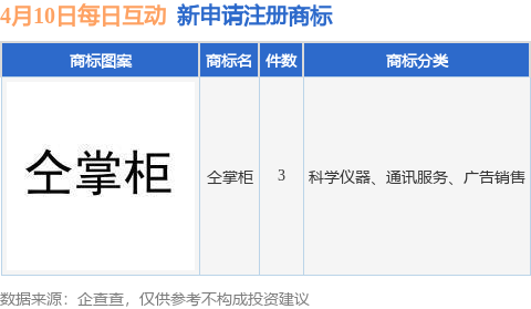 证券之星消息,根据天眼查APP数据显示,近日每日互动股份有限公司新提交“仝掌柜”等3件商标注册申请。商标申请详情如下: