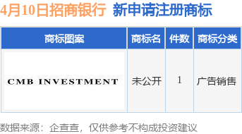 今年以来招商银行股份有限公司新申请注册商标4件,截止目前公司共持有注册商标2551件,另有130件商标尚在注册申请中。