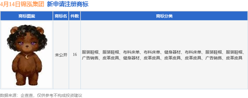 今年以来锦泓时装集团股份有限公司新申请注册商标33件,截止目前公司共持有注册商标2990件,另有87件商标尚在注册申请中。结合公司2025年年报财务数据,2025年公司在研发方面投入了1.36亿元,同比增8.05%。