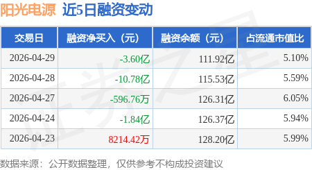 证券之星消息,4月29日,阳光电源(300274)融资买入14.05亿元,融资偿还17.66亿元,融资净卖出3.6亿元,融资余额111.92亿元。