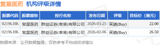 截至2026年4月30日收盘,复星医药(02196.HK)报收于19.11港元,下跌2.4%,成交量352.82万股,成交额6781.76万港元。投行对该股的评级以买进(Buy)为主,近90天内共有2家投行给出买进(Buy)评级,近90天的目标均价为24.25港元。群益证券(香港)有限公司最新一份研报给予复星医药买进(Buy)评级,目标价22港元。