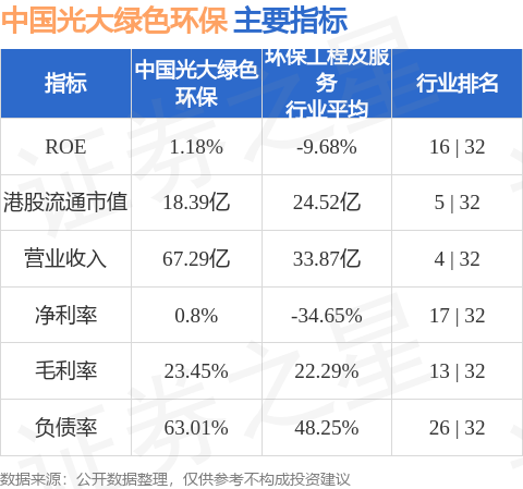 中国光大绿色环保港股市值18.39亿港元,在环保工程及服务行业中排名第5。主要指标见下表: