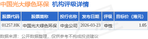 截至2026年4月30日收盘,中国光大绿色环保(01257.HK)报收于0.88港元,下跌1.12%,成交量3.7万股,成交额3.29万港元。投行对该股的评级以中性为主,近90天内共有1家投行给出中性评级,近90天的目标均价为1.05港元。中金公司最新一份研报给予中国光大绿色环保中性评级,目标价1.05港元。