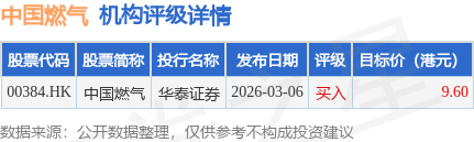 截至2026年4月30日收盘,中国燃气(00384.HK)报收于7.26港元,下跌2.16%,成交量1131.82万股,成交额8224.3万港元。投行对该股的评级以买入为主,近90天内共有1家投行给出买入评级,近90天的目标均价为9.6港元。华泰证券最新一份研报给予中国燃气买入评级,目标价9.6港元。