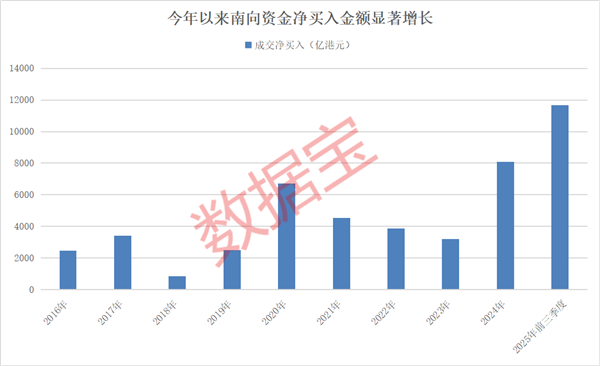 据证券时报·数据宝统计,第三季度南向资金合计成交净流入4363.22亿港元,年内已累计净买入11675.15亿港元,超过2023年与2024年净买入金额之和。