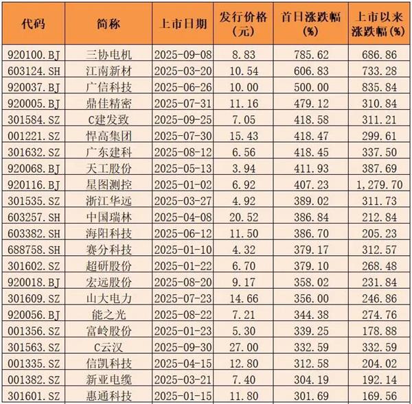 上市首日表现上,三协电机、江南新材、广信科技位居前三甲,涨幅分别为785.62%、606.83%和500%。紧随其后的是鼎佳精密、建发致新、悍高集团、广东建科、天工股份和星图测控,首日涨幅均超过400%。而首日涨幅超300%的22股,主板、创业板和北交所各占7只,科创板1只。