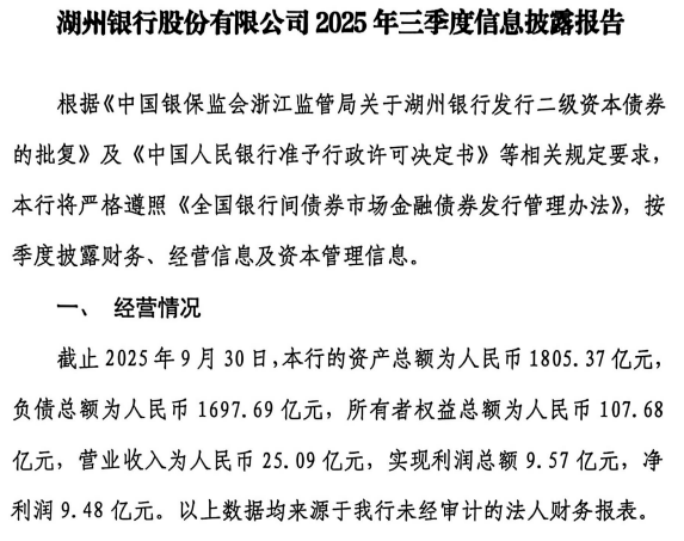 公开资料显示,湖州银行前身为湖州市商业银行,成立于1998年6月,2010年更名为湖州银行。截至2025年三季度末,全行资产总额为1805.37亿元,下辖湖州市、杭州市、嘉兴市等三地100个营业网点,已发展成为湖州地区资产规模最大、营业网点最多、综合实力最强的银行业金融机构。