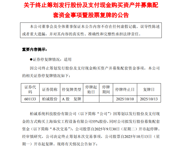 10月10日晚间,柏诚股份(601133)发布公告称,决定终止筹划以发行股份及支付现金的方式购买上海灿实工程设备有限公司(以下简称“上海灿实”)55%股份的事项。这意味着,这场从9月30日开始停牌筹划的并购案,仅10天就宣告终止。