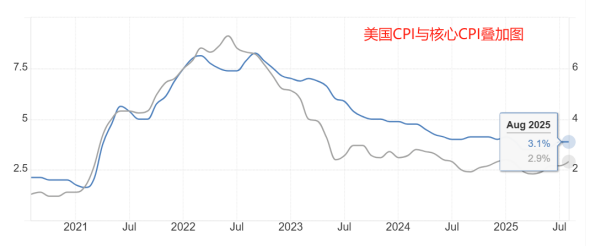关于通胀表现,褐皮书中提到:在本报告所述期间,价格进一步上涨;许多地区都报告了关税引起的投入成本增加,但这些增加的成本转嫁到最终价格的程度各不相同。从这段描述可以看出,美国的通胀数据仍受到特朗普关税政策的影响。从美国CPI和核心CPI年率的叠加图可以看出,两者已经在2024年7月份之后进入平稳期。目前处于3%附近的通胀率数据,对于美联储的降息政策不具有威胁性。如果未来CPI数据因为高关税而持续做高,美联储可能不得不降低降息的频率和幅度。