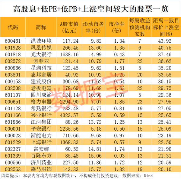 进一步从估值与市场表现分析,这批经过筛选的股票中,多股具备低市盈率、低市净率的特征,且未来上涨空间充足。据数据宝统计,截至10月27日,滚动市盈率(PE)低于20倍,市净率(PB)低于2倍,且收盘价较机构一致预测目标价上涨空间超20%的股票有20只。洪城环境、凤凰传媒、光大银行、索菲亚、星湖科技等上涨空间靠前。