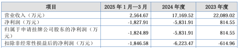 证券之星了解到,宏泰科技曾冲击IPO失利,后转道新三板基础层,该公司新三板挂牌材料于今年9月被正式受理。根据申报材料,2023年、2024年和2025年一季度,宏泰科技营收分别为2.21亿元、1.72亿元和2564.67万元,归母净利润分别为814.55万元、-5831.91万元和-1824.89万元,毛利率则分别为44.22%、37.69%和34.02%。
