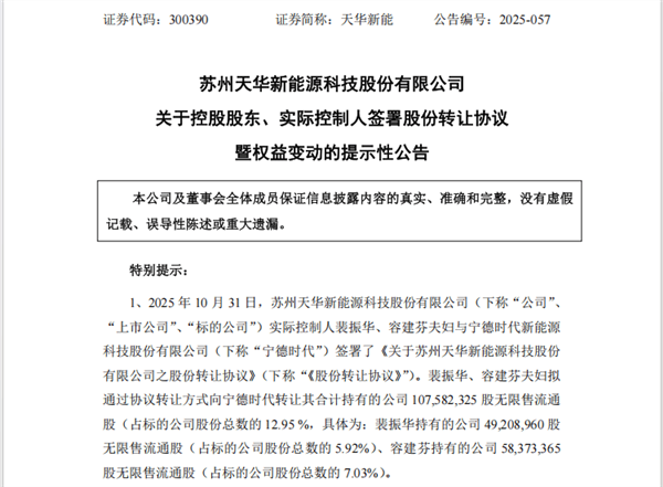10月31日晚间,天华新能发布公告称,公司实控人裴振华、容建芬夫妇拟通过协议转让方式,向宁德时代合计转让所持12.95%的公司股份,转让价款合计达26.35亿元。