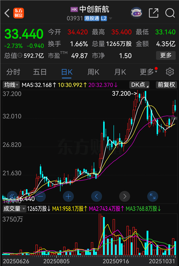 截至10月31日收盘,中创新航港股股价报33.44港元/股,跌幅达2.73%,总市值为592.7亿港元。