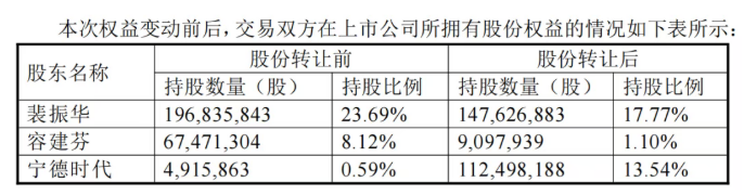 交易完成后,裴振华、容建芬、宁德时代持有天华新能的股份比例,分别为17.77%、1.10%、13.54%。