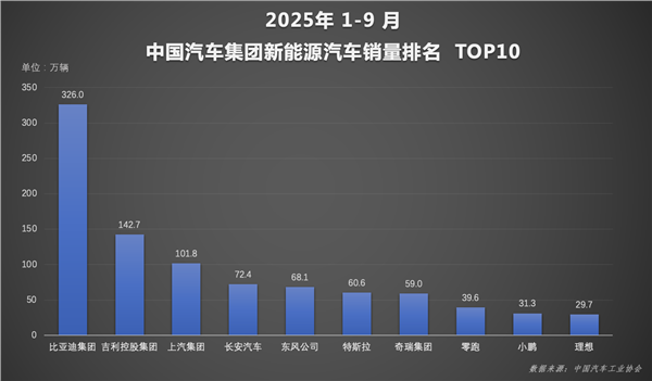 根据官方数据,1–9月比亚迪集团累计销量达326万辆,同比增长18.6%,稳居中国车市销量榜首。其中,比亚迪汽车累计销量298.5万辆,是第二名的两倍还多,行业领先地位无可撼动。