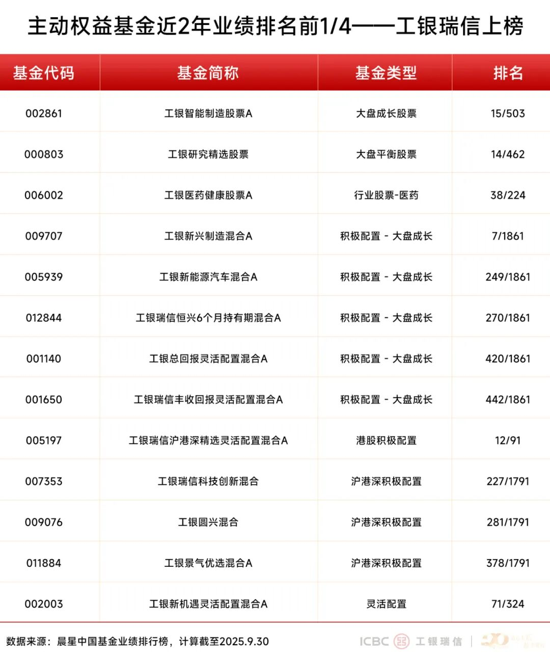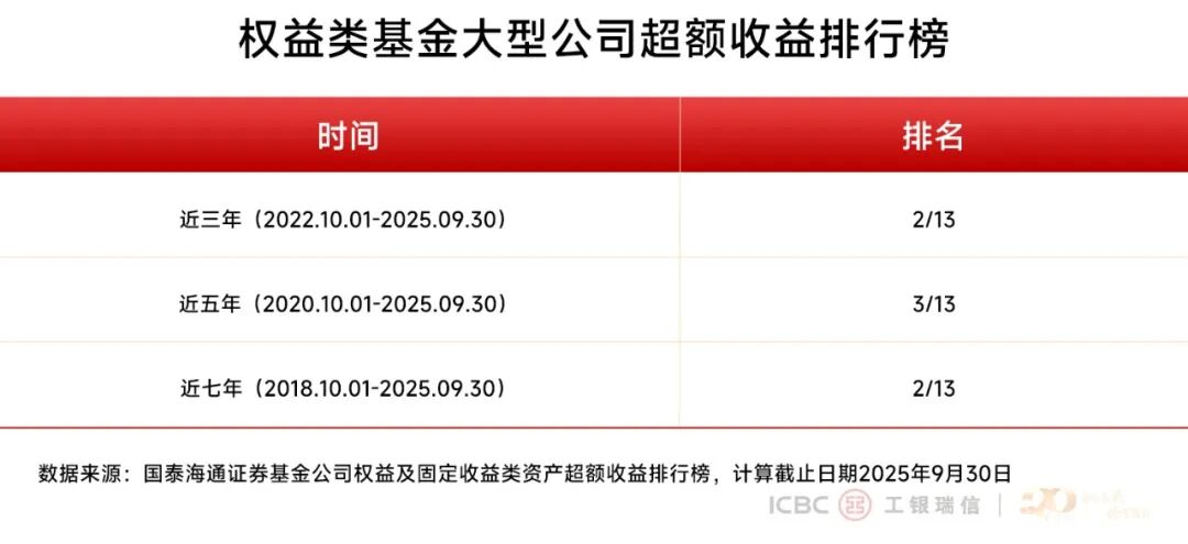 3、权益类大型超额收益排名、权益类基金超额收益排名来源于国泰海通证券,数据截至2025年9月30日。工银瑞信权益类基金大型公司超额收益七年(2018. 10.01-2025.9.30)行业2/13,近五年(2020.10.01-2025.09.30)行业3/13,近三年(2022.10.01-2025.09.30)行业2/13;工银瑞信权益类基金大型公司绝对收益近七年(2018. 10.01-2025.9.30)行业3/13,近五年(2020.10.01-2025.9.30)行业3/13,近三年(2022.10.01-2025.09.30)行业3/13。
