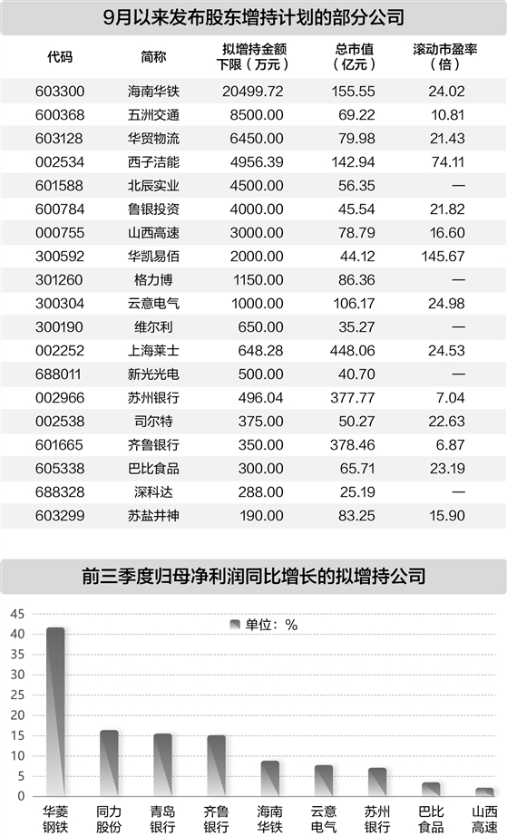 据证券时报·数据宝统计,9月以来共有24家上市公司披露股东增持计划(剔除一致行动人内部转让),发布股东增持计划的上市公司中,19家披露了拟增持金额下限或已增持完毕,合计达到5.99亿元,10家拟增持金额在1000万元及以上,海南华铁、五洲交通、华贸物流拟增持金额下限居前,分别为2.05亿元、8500万元、6450万元。