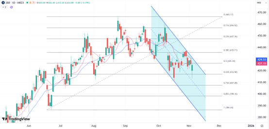 从估值看,当前港交所对应P/E约30-35倍,虽然接近一年高点,也高于历史平均(约25-30倍),但低于高增长科技公司。业绩超预期可能已推动股价近期上涨,但估值是否过高取决于未来增长可持续性。当前估值部分定价了交易量新高,但未完全反映IPO和衍生品的长期潜力。今日绩后股价跟随大市受到显示,但短期股价会继续消化业绩利好,但能否带动突破日图均线阻力重回10月中旬以来区间的顶部,重返高位范围的关键阻力在440港元。